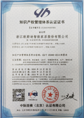 熱烈祝賀浙江歐斯迪智能家居股份有限公司順利通過了知識產(chǎn)權(quán)管理體系審核,并于2020年底獲得《知識產(chǎn)權(quán)管理體系認證證書》(證書編號:ZJLH20IP0407ROS),這標志著歐斯迪在知識產(chǎn)權(quán)領(lǐng)域得到充分認可。